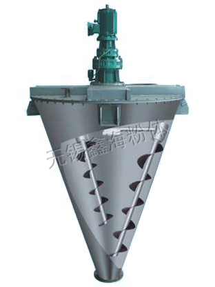 由于雙螺旋的公轉(zhuǎn)而使粉體沿著錐體壁作圓周運動。螺旋葉片的自轉(zhuǎn),使粉體向錐體中央排放作徑向運動。粉體自錐體向上升流及螺旋外圓周表面上排出,即螺旋軸方向混合。螺旋在混料機內(nèi)公轉(zhuǎn),自轉(zhuǎn)的組合,造成了粉體的四種流動形式,也就是對流,剪切,擴散,滲合的復(fù)合運動。因此粉體物料在這種混料機內(nèi)能迅速達(dá)到均勻的混合。
